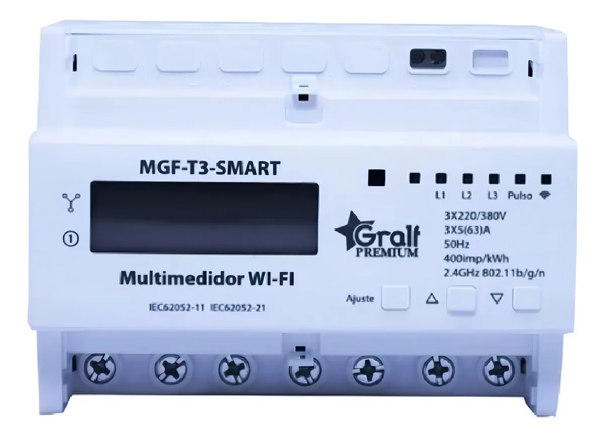 El MGF-T3-SMART es un multimedidor trifásico con conectividad Wi-Fi que combina medición de consumo eléctrico y protección avanzada contra sobrecarga, alta y baja tensión. Está diseñado para proteger equipos e instalaciones trifásicas, permitiendo además monitorear el consumo energético en tiempo real desde el celular.